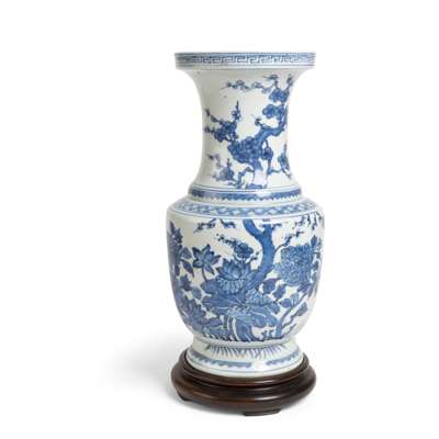 of baluster form with a dish-like wide mouth, painted to the body with lotus, prunus, and peonies, the prunus further grows on the waisted neck, the base unglazed, with a wooden stand