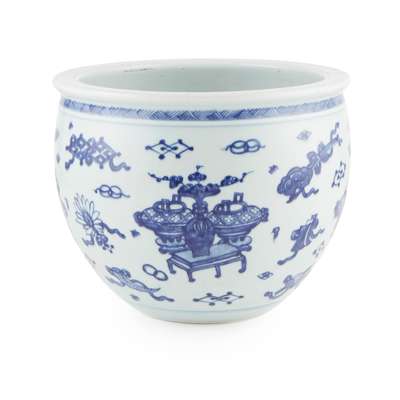 the deep bulbous body painted with four sets of antiquities arrangement surrounded by eight auspicious emblems