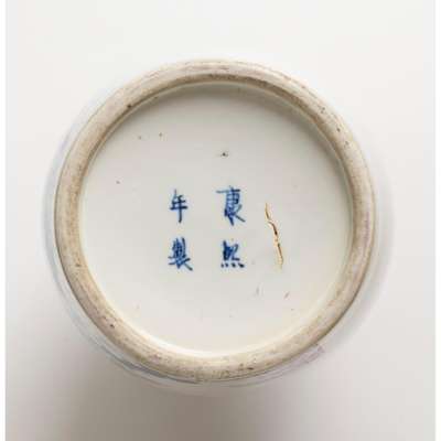the bulbous body finely painted with two birds perching on a tree brunch with peony flowers, with an apocryphal four-character Kangxi mark in underglaze blue, with a wooden base