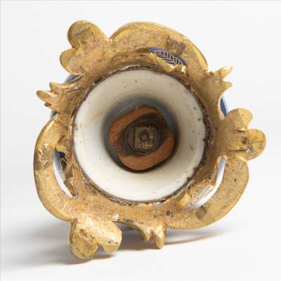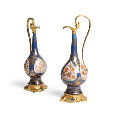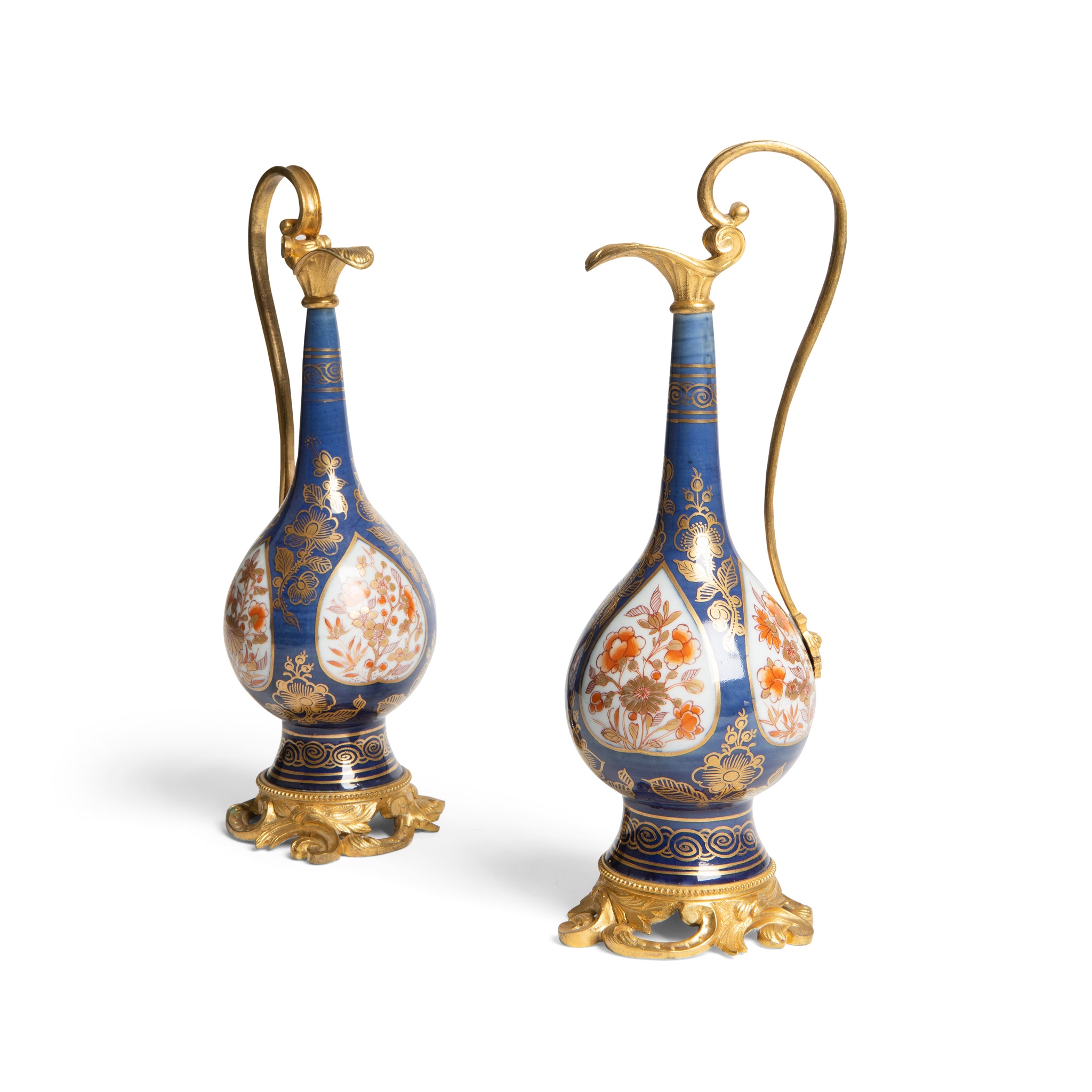 each bulbous body supported on a tall splayed foot extending to a slender neck, the body decorated with floral patterns in overglaze iron red paint within tear-drop shaped cartouches, the rest of the body applied with a layer of blue glaze, overall highlight with well-preserved gilt paint, the vase mounted on an elaborate European style gilded bronze stand, spout and elegantly arched handle