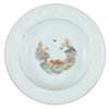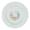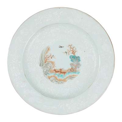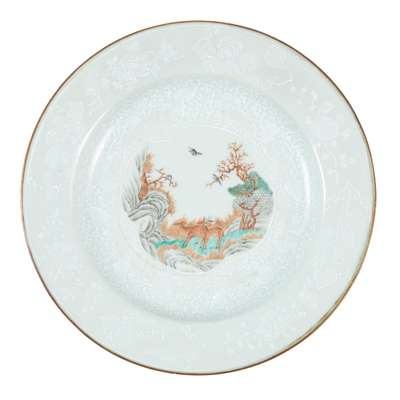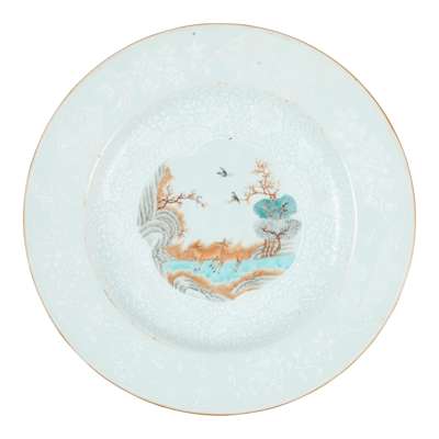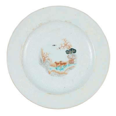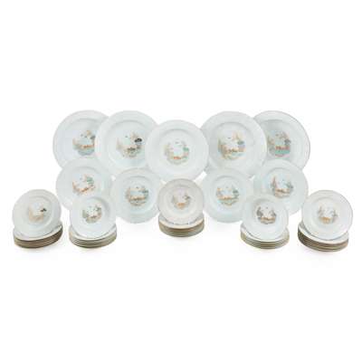 each finely decorated in quatrefoil cartouche with two deer in natural landscape, bare trees surrounding them perched by birds, rocks outlined and detailed in grisaille, reserved on a white-enamelled scrolling flowers ground, comprising of 25 pieces of dish; 12 pieces of soup plate; 4 pieces of smaller plate; 1 piece of medium plate; 2 pieces of smaller charger and 2 pieces of large charger