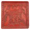 of shallow square form, central panel carved in relief with scholar and attendant holding a wrapped qin musical instrument in a courtyard surrounded by stones and hills afar, framed by a border of flowers and foliage, the exterior further decorated with floral motifs, the base lacquered in black
