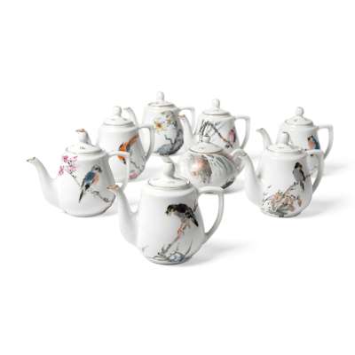 GROUP OF EIGHT QIANJIANG-ENAMELLED LIDDED TEAPOTS
