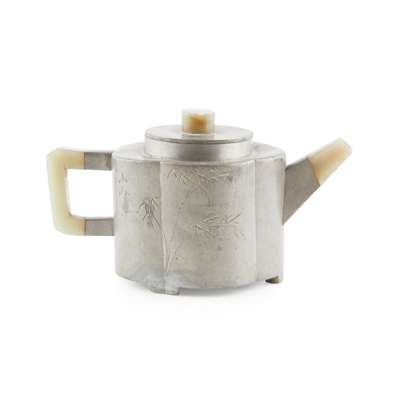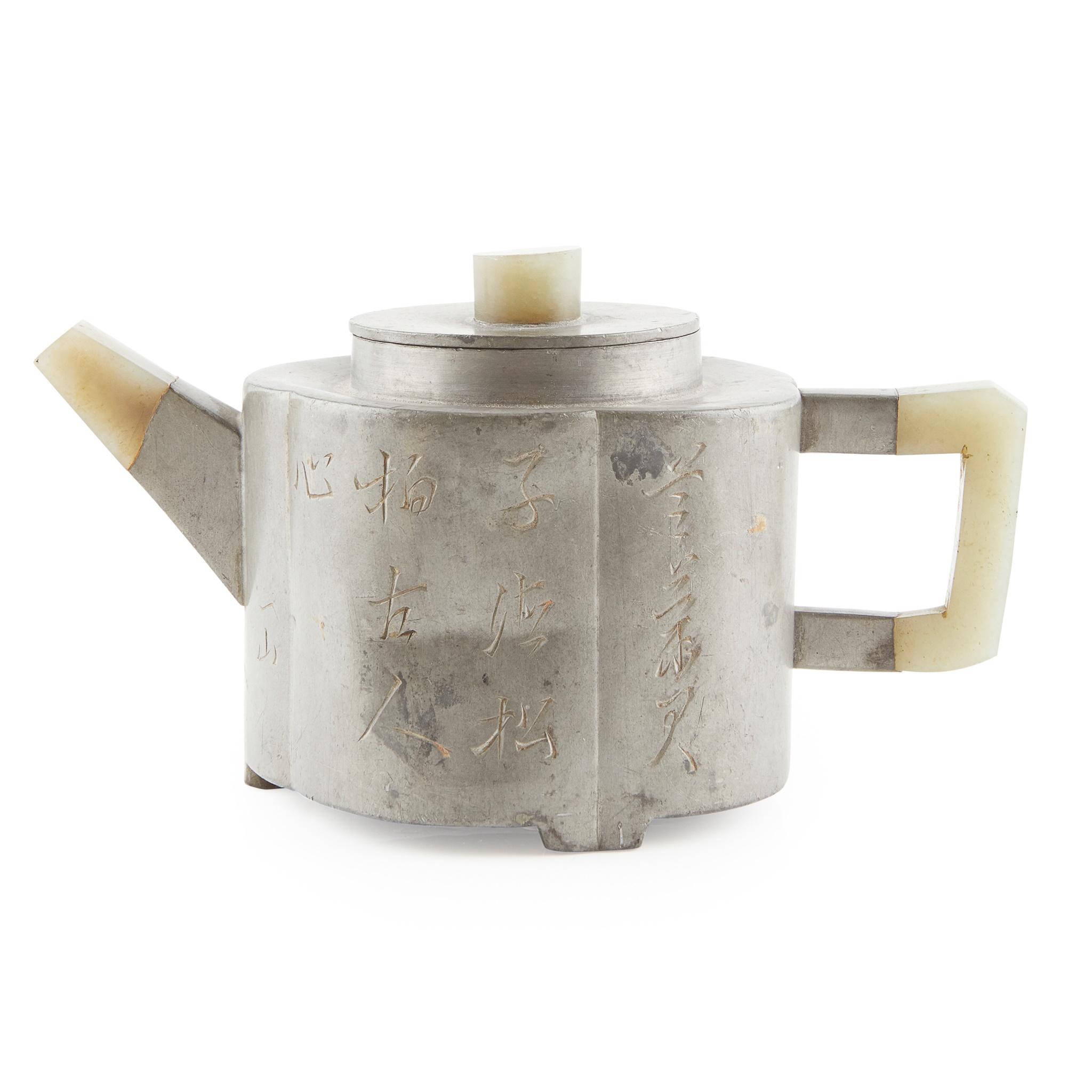 PEWTER ENCASE AND JADE MOUNTED YIXING STONEWARE TEAPOT