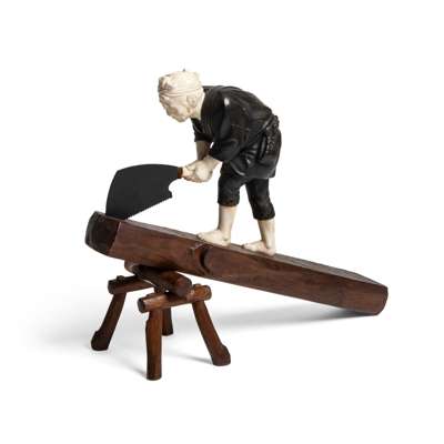 the figure leaning forwards and balancing on a raised trunk, he holds a large saw cutting through the elevated end, his clothes cast in bronze, flesh inset with finely carved ivory