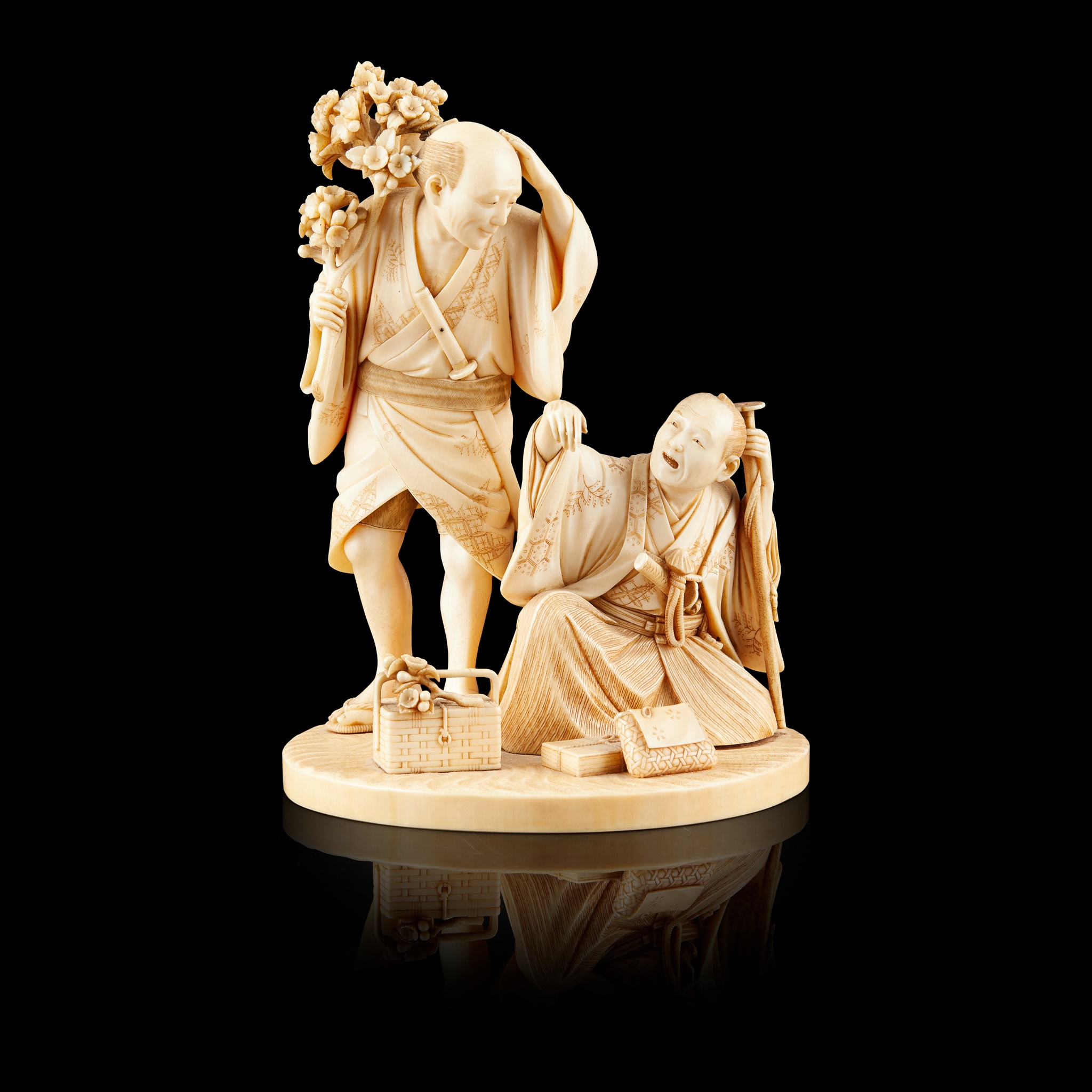 the figure finely carved with a weaved carrier box and two smaller containers on the swirly foreground, the standing figure holds a flowering branch over his right shoulder, left hand touching his head, casting down to a kneeling nobleman supported by a katana on his left, both with finely incised pattern on the robes