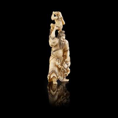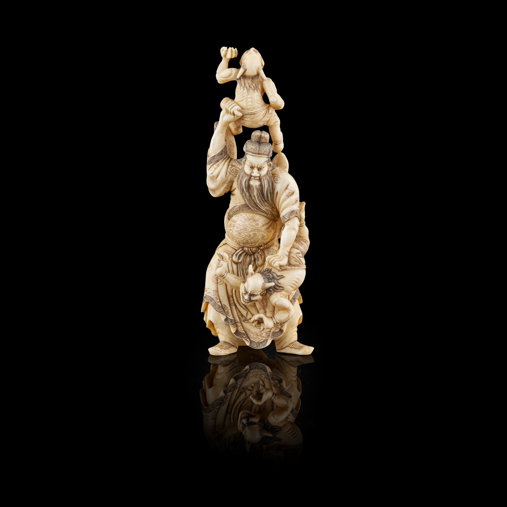 finely carved with the demon queller in fierce expression swinging an oni over his head, another around his legs
