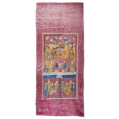 embroidered with the scene of the birthday reception for General Guo Ziyi, the attendees spreading across in a symmetrical order with cranes and a deer, some costumes and outlines refined and decorated with gold threads in couching stitch, all faces very finely painted, all on a purple silk ground