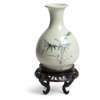of pear-shaped body with a flaring mouth, the body covered thoroughly in thick white glaze and painted freely with bamboo in underglaze blue, with a carved wooden stand