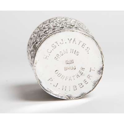 of cylindrical form, densely decorated in medium relief with floral and foliate scrolls, base inscribed: ‘A.C. St. J. YATES FROM HIS GODFATHER P.J. HIBBERT’, and stamped: O.M. BHUJ