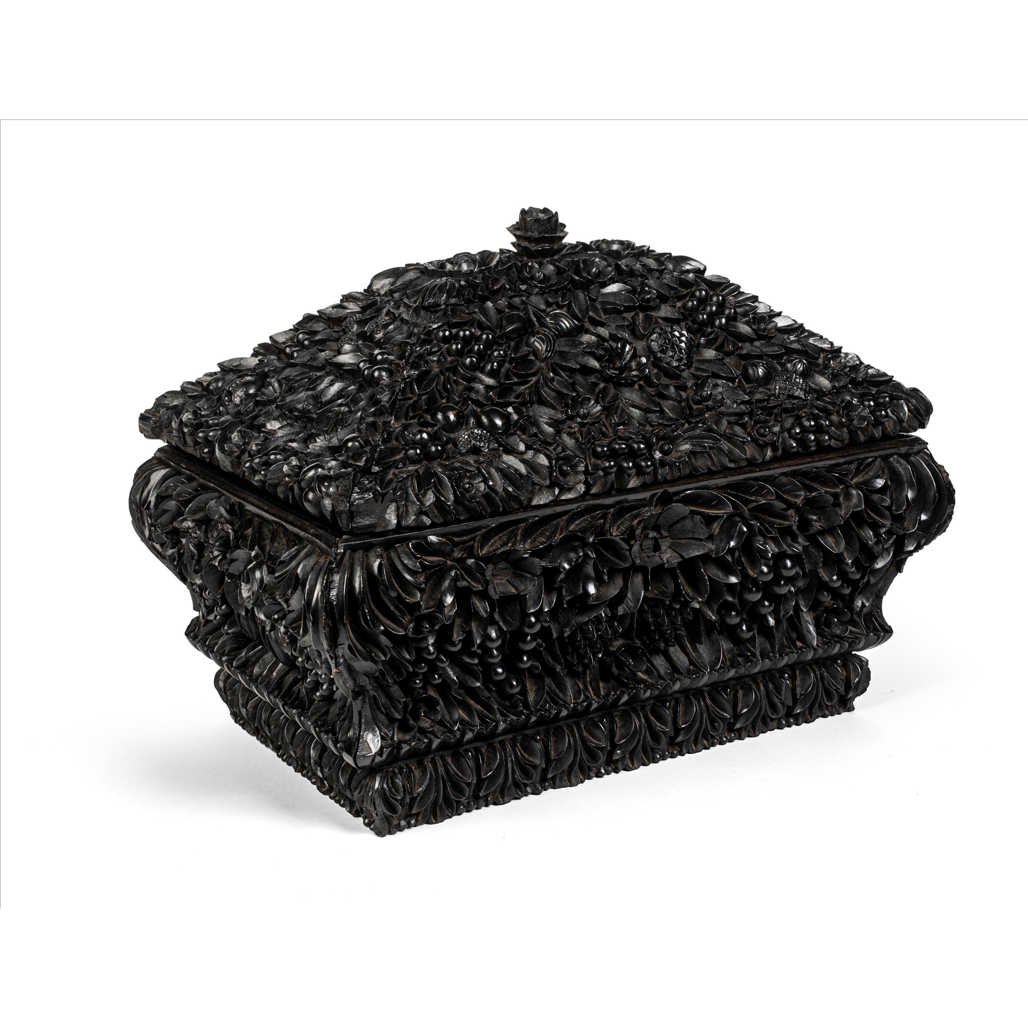 intricately carved all over with flowers, fruits and foliage in medium relief, the hinged lid topped with a flower finial, opening to reveal a void interior set with lock, above a similarly carved tapered body