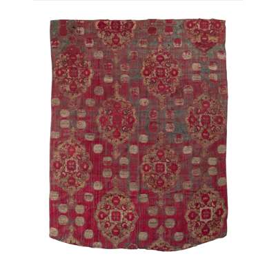 rectangular, the crimson silk ground woven with gilt and silk thread, the design incorporating ogival medallions containing pomegranates and flowerheads, surrounded in turn by golden spheres, backed