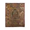 Note: “The Buddha image is preaching with his right hand and in his left he holds the monastic begging bowl. Much of the charm of the painting is in the lovely views of typically Tibetan architecture of monasteries, shrines and houses. Monks are seen preaching (top right) and meditating (top left) as well as listening to variety of Lamas from different spiritual traditions defined by their hat styles. The wrathful protection deity is below the main figure.” - viewed by Dr. David Templeman, Monash University of Melbourne, Australia.