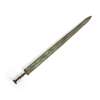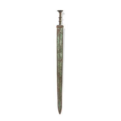 cast with a long, double-edged blade tapering to a fine tip and a median ridge on each side, the cylindrical handle with two raised rings and a wide flattened hilt, probably of Dian Culture