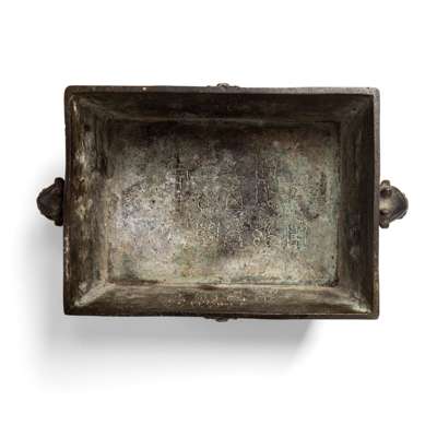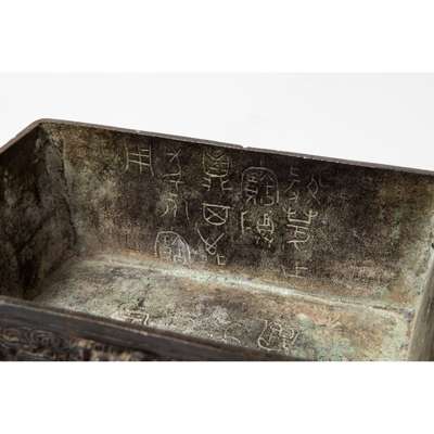 of tapering rectangular shape standing on four cornered-feet incised with taotie masks, the exterior with raised crashing waves and mythical beasts, flanked by horned-mythical beasts as looped handles, the plain interior engraved with archaic inscriptions