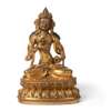cast seated in dhyanasana on a double lotus base, holding a crossed-vajra to his right hand raised before chest, left with drilbu tucked against his hip, the bodhisattva wears a dhoti, heavily adorned with jewelled necklets, an elaborate tiara surrounds his high chignon topped with finial, the figure richly gilded overall, the front of the lotus seat incised with a line of six-character Yongle mark, the base engraved with a crossed vajra