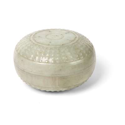 supported on a short straight foot, both the domed box and cover carved in low relief with a band of Han-style raised dots, the centre of the cover decorated with a lotus flower in medallion, the rims of the cover and the box incised with triangular pattern, the stone of greyish celadon colour with brownish inclusions