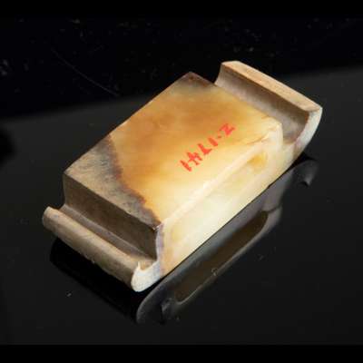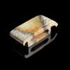 of rectangular form with curved ends, carved with raised scrolling bosses on the top, rectangular loop to the reverse, the dark green stone with brown and grey inclusions to both sides