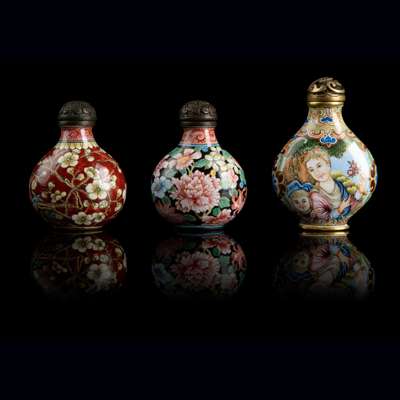 GROUP OF THREE PAINTED ENAMEL SNUFF BOTTLES