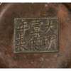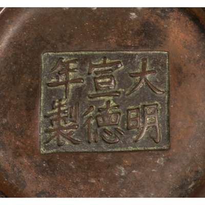 heavily cast with a compressed pear-shaped body, rising from a short foot to a waisted neck and flared mouth, the shoulder flanked with two mythical beast heads, the base cast with a six-character Xuande mark in a recessed square panel, with a wooden cover inset with a white jade finial of a standing attendant