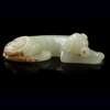 carved as a slender recumbent dog with its head slightly raised to right above two front legs, ears tucked down, tail coiling on rear hind, the stone of even translucent pale green colour with patches of dark brown skin especially on its rear hind and its nose tip