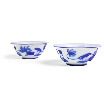 PAIR OF BLUE-OVERLAY WHITE PEKING GLASS BOWLS