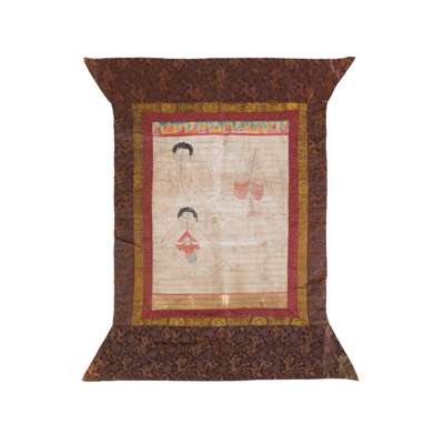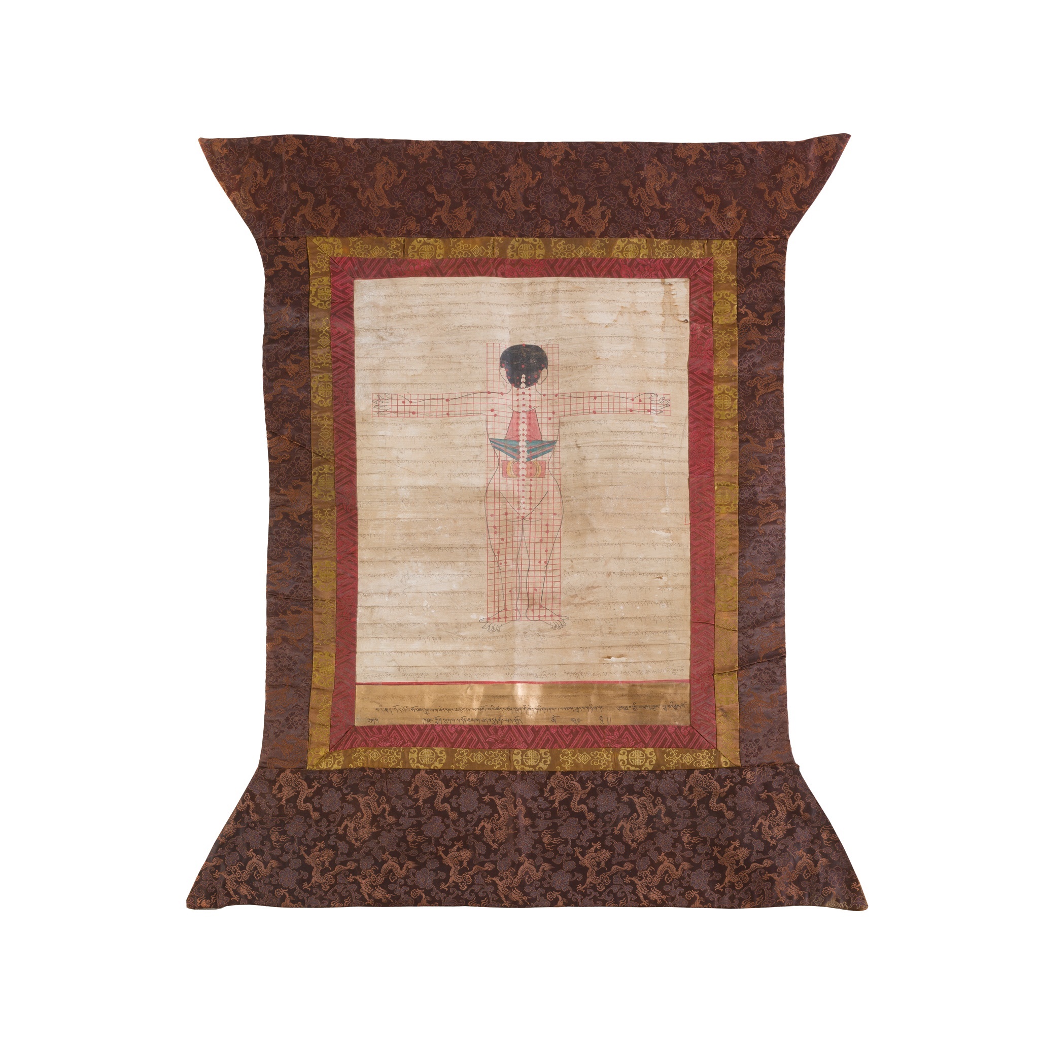 comprising: a thangka depicting a naked human's back with arms spread, pigmented upper and mid body internals, covered allover in symmetrical red grid with various dots at which moxibustion should be applied, reserved on inscriptions taken from the Medical Text 'Gyud Zhi' explaining the reasons; and the other depicting human's energy movement, including a male's body, a flayed body with internals exposed, and a skeleton in ardhaparyank asana position reserved on inscriptions, each figure painted with blood vessels throughout the whole body, and a green line cut through from the top of the head to perineum