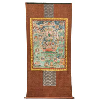 seated in lalitasana on a multi-coloured lotus throne elevated with a pedestal, her right foot resting on a smaller pink lotus, left hand raised in abhaya mudra and right lowered in varada mudra, both issuing a lotus stem, wears a creamy coloured top finely detailed with scrolling lotus, heavily adorned with features in gilt, a colourful band surrounding her, further with a band of lineage masters, out with mountainous and celestial landscapes scattered with Buddhist teaching narratives
