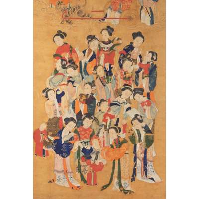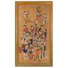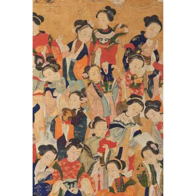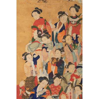 painted with a female deity seated on a chariot pulling by a lion and protected by a guardian god, followed by a female attendant holding a large fan, below the scene with a various female figures each holding a new-born babe in hands