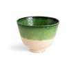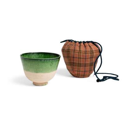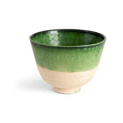 supported on a short foot with flattened base, rising to rounded sides and gently everted rim, applied with a luscious green glaze in the interior and stops irregularly around the middle of the exterior, exposing the creamy buff body, with a fitted Japanese cloth pouch and a tomokako wooden box