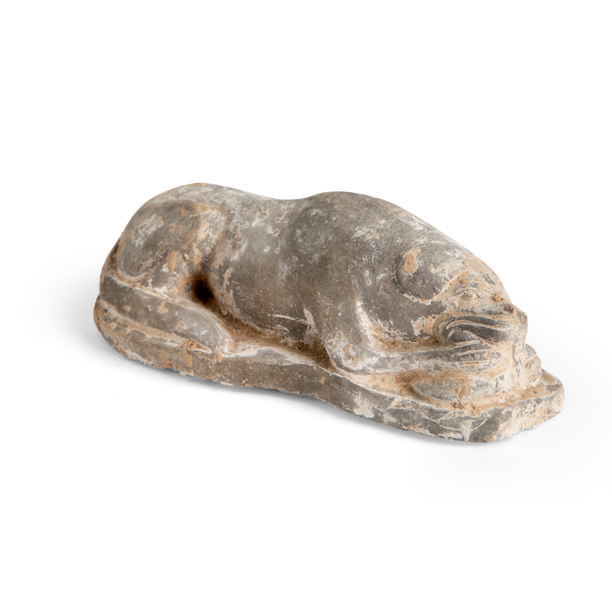 moulded as a recumbent dog on a plinth, its head tucked between two front paws, the body hallowed from the base