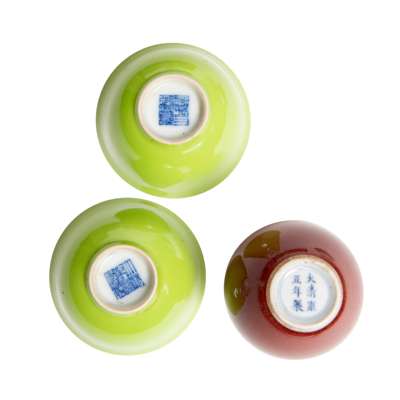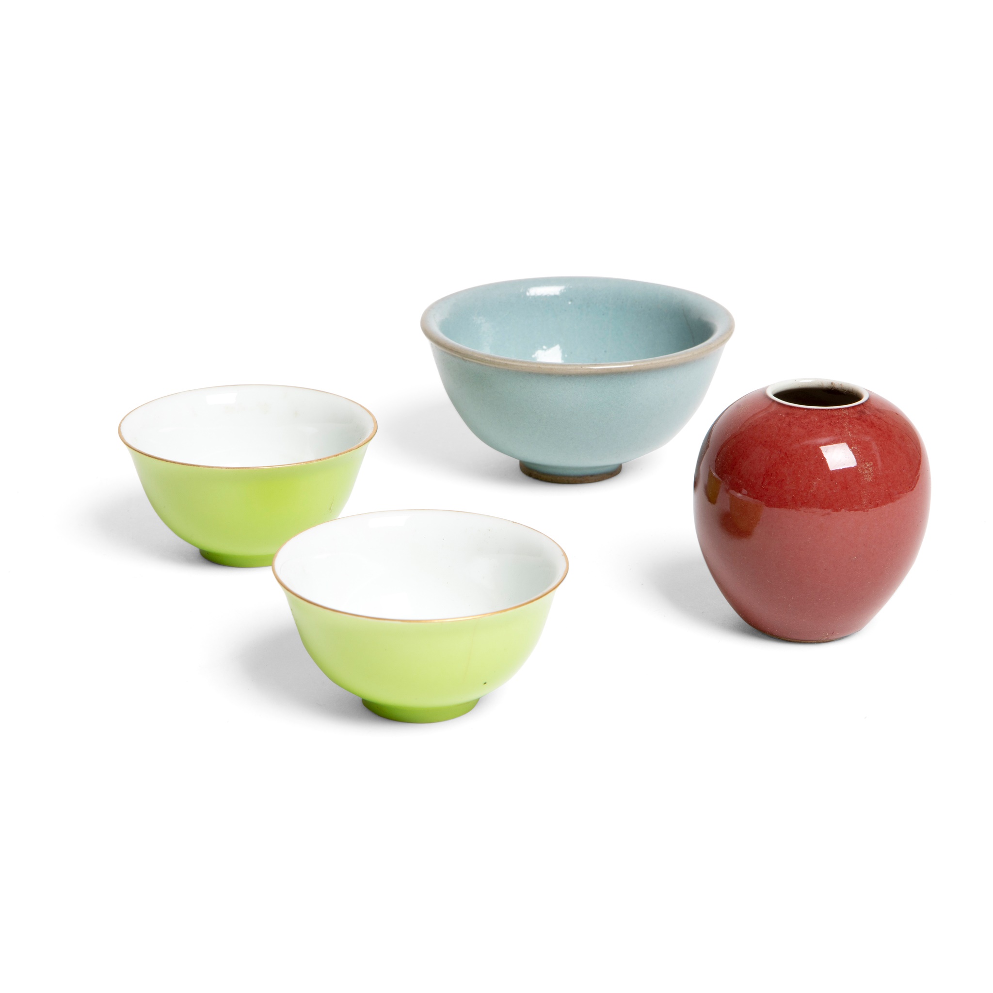 comprising: a pair of small tea cups covered in lemon-green glaze on the exterior and gilded mouth rim, the base inscribed with a six-character Qianlong mark in underglaze blue, 7cm diameter, together in a fitted wooden box; a tea bowl covered overall in a sky-blue glaze imitating jun-glaze, leaving only the foot rim unglazed, 9.3cm diameter, in a fitted wooden box with a paper collector's label; together with a small ovoid jar, the exterior covered in a red-glaze, the base inscribed with a six-character Yongzhen mark in double-circles in underglaze blue, 6.5cm high, in a fitted wooden box with collector's paper on the cover