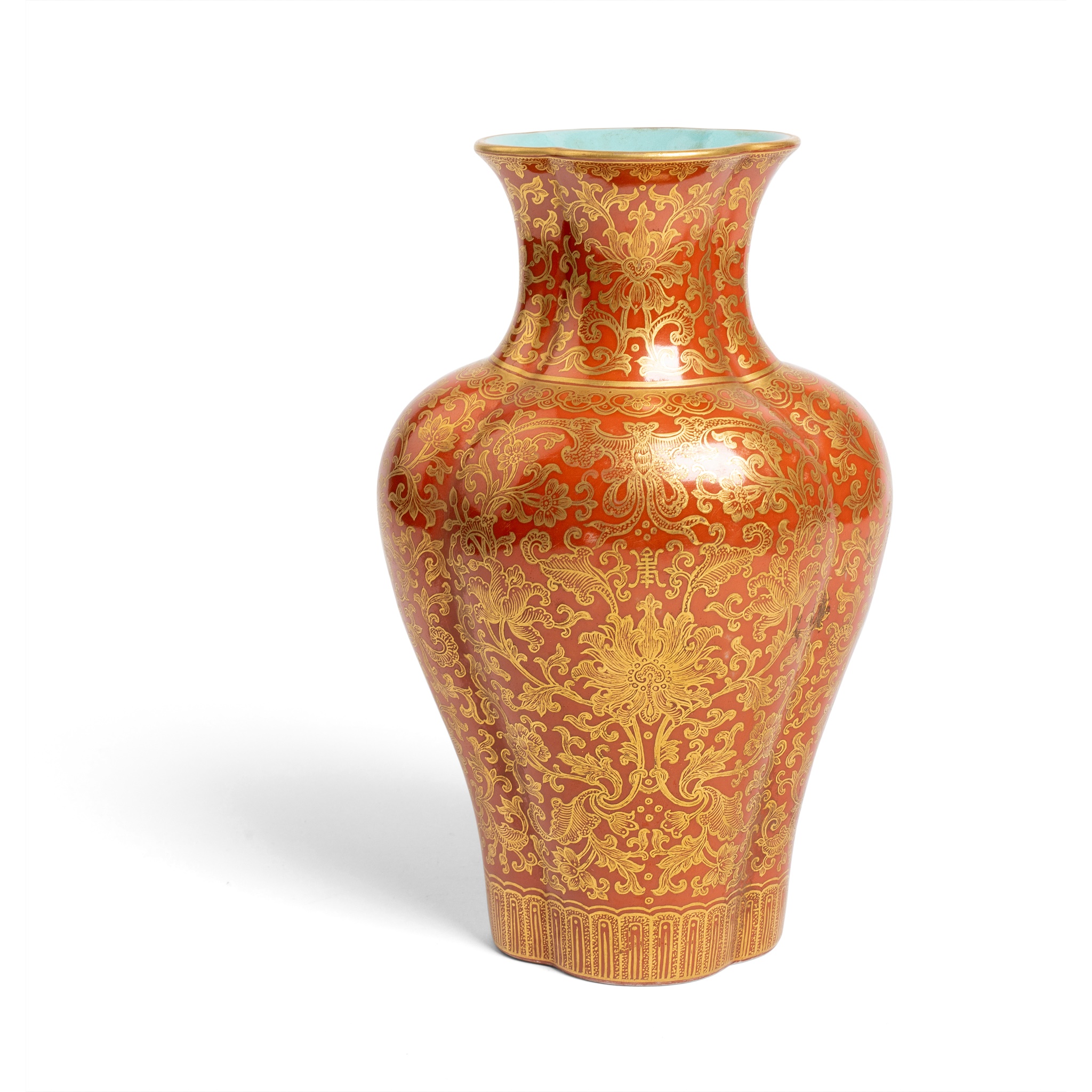 GILT-DECORATED CORAL-RED GROUND LOBBED VASE