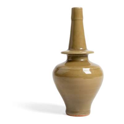 the baluster body supported on a short tapering foot, the long cylindrical neck rising out of a pronounced flange above the shoulder, the exterior and the base covered overall with an unctuous olive green glaze, stopping unevenly to reveal the burnt orange foot