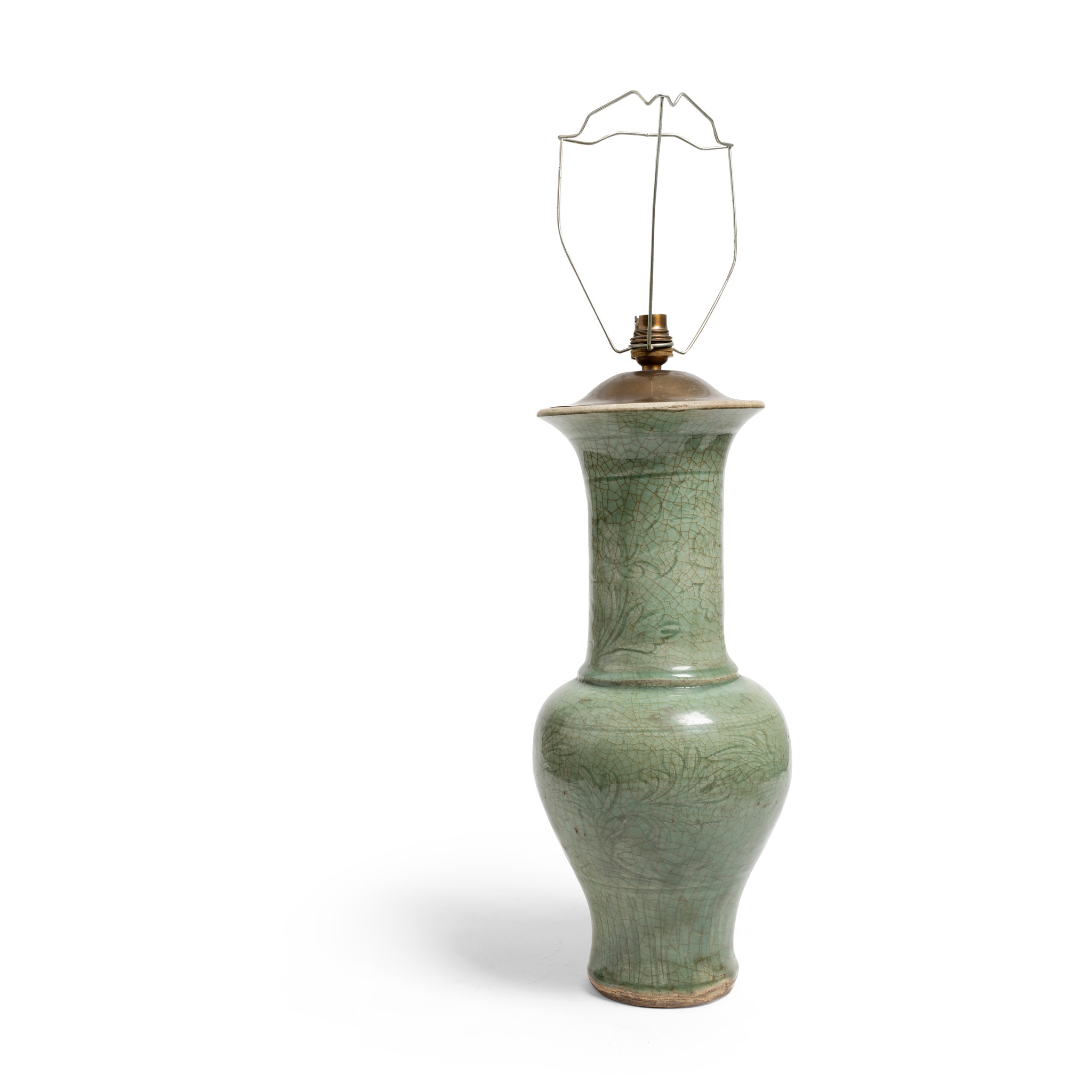 sturdily potted on a waisted tall foot to a globular body, raised to an elongated waisted neck and flared mouth, decorated with carved floral motif, covered overall save for the ring foot with a green glaze, converted later to a lamp stand
