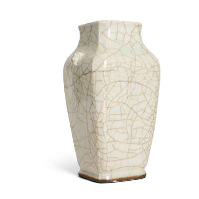 sturdily potted with four notched corners, raised from an everted foot to a tapered body, waisted neck and flared rim, perforated elephant-head masks with convex loops and flanked the sides, covered overall with a creamy greyish glaze suffused with distinct network of dark-brown, faint-russet and white crackles, leaving the foot rim unglazed and revealing the dark-brown body