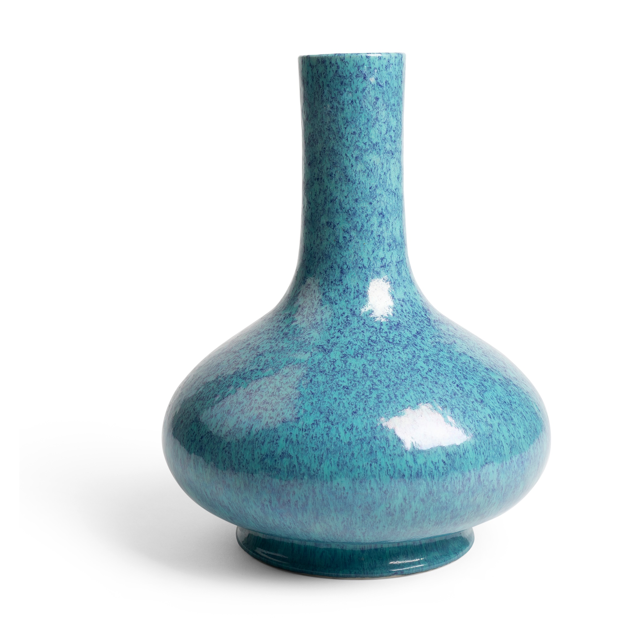 of compressed globular form supported on an everted foot, raised to a straight cylindrical neck, covered overall save for the ring foot with finely mottled turquoise and blue glaze