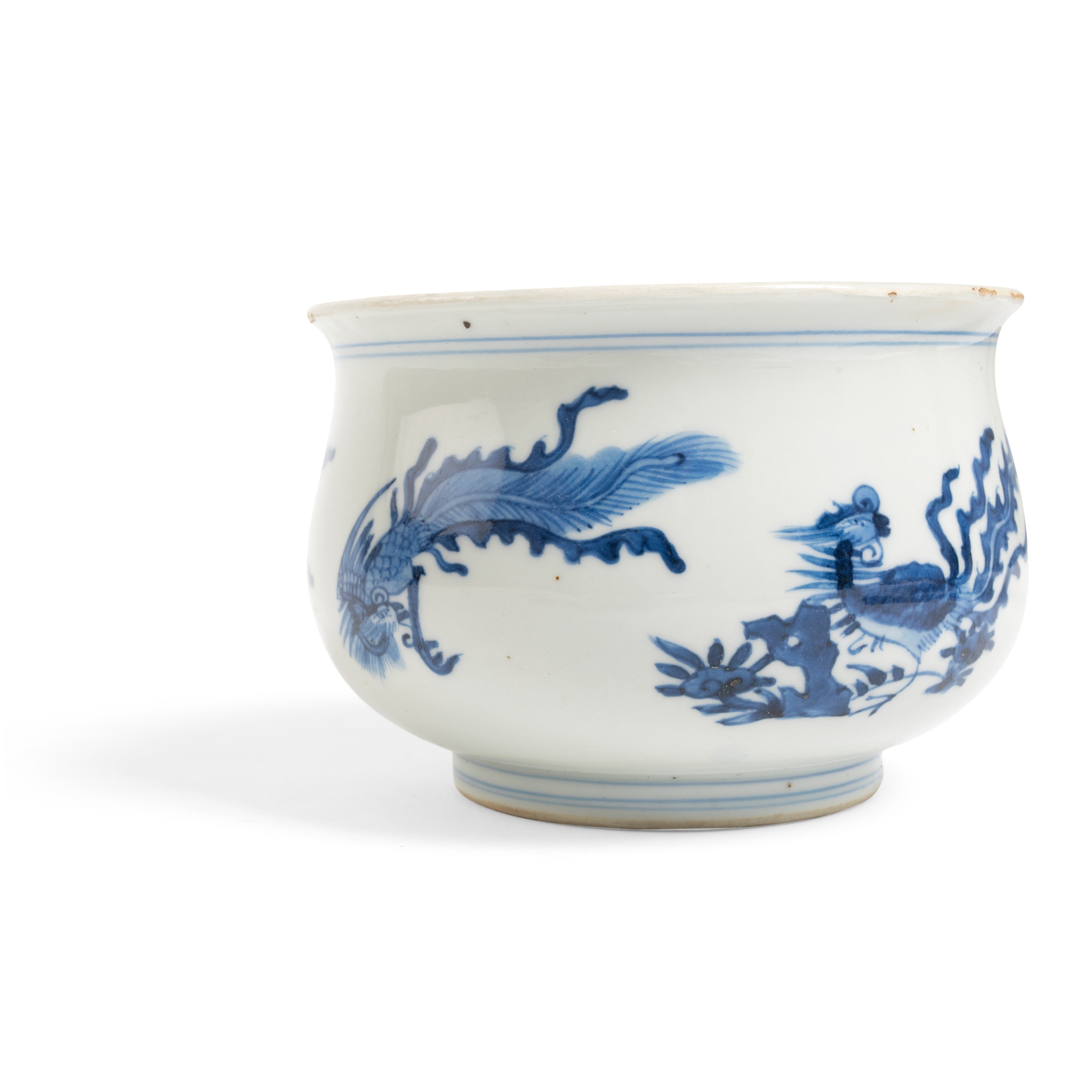 of compressed globular form, painted on the exterior with two pairs of phoenixes, one diving down with the elaborate tails above, two flying horizontally in graceful manner, the fourth one standing beside a rock