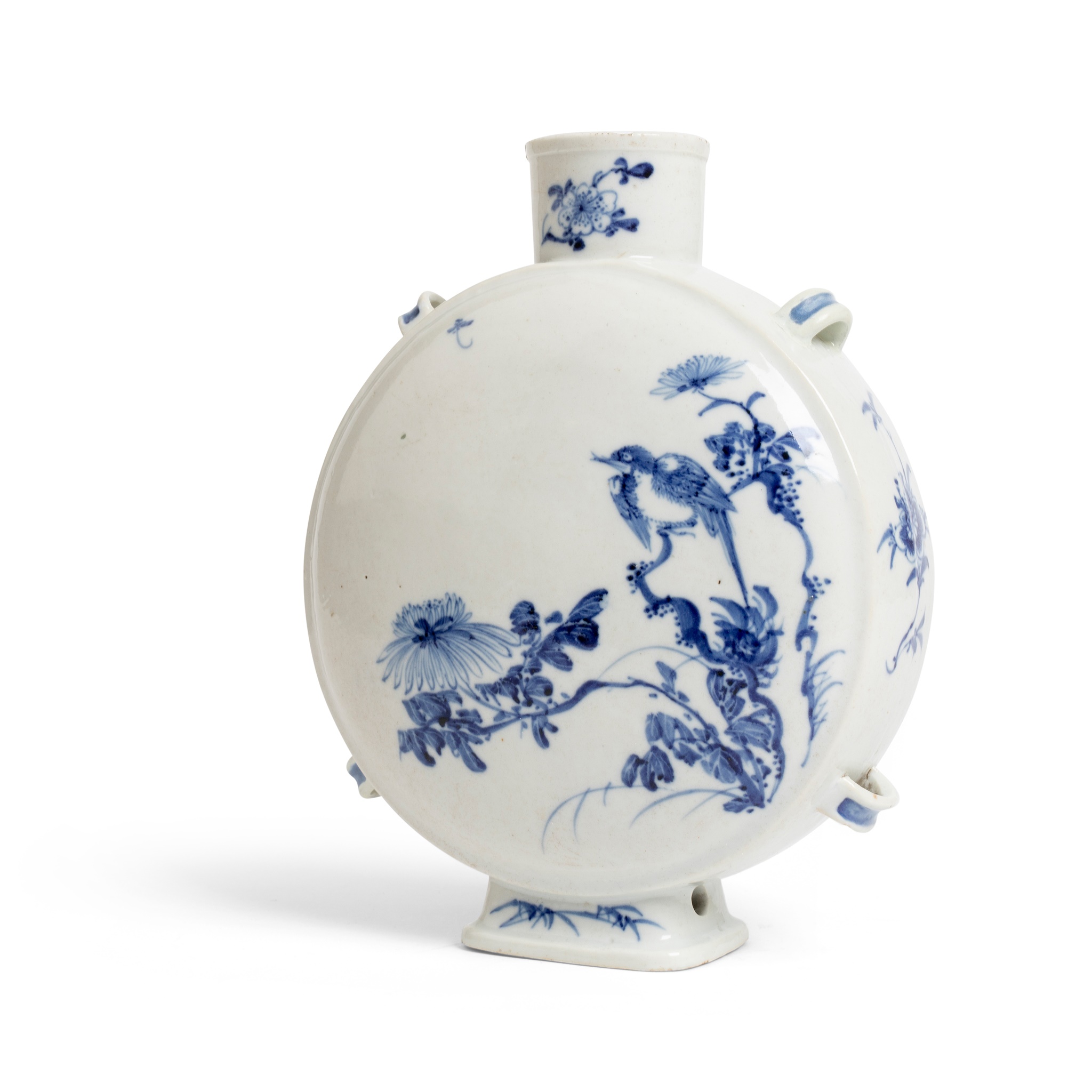 the body of flattened circular form, supported on a short splayed foot with two holes on the shorter sides, topped with a short straight neck with lipped mouth rim, the narrow sides of the body attached with four bands of raised nobs, either side of the body decorated with various birds perching on blossoming flower branches