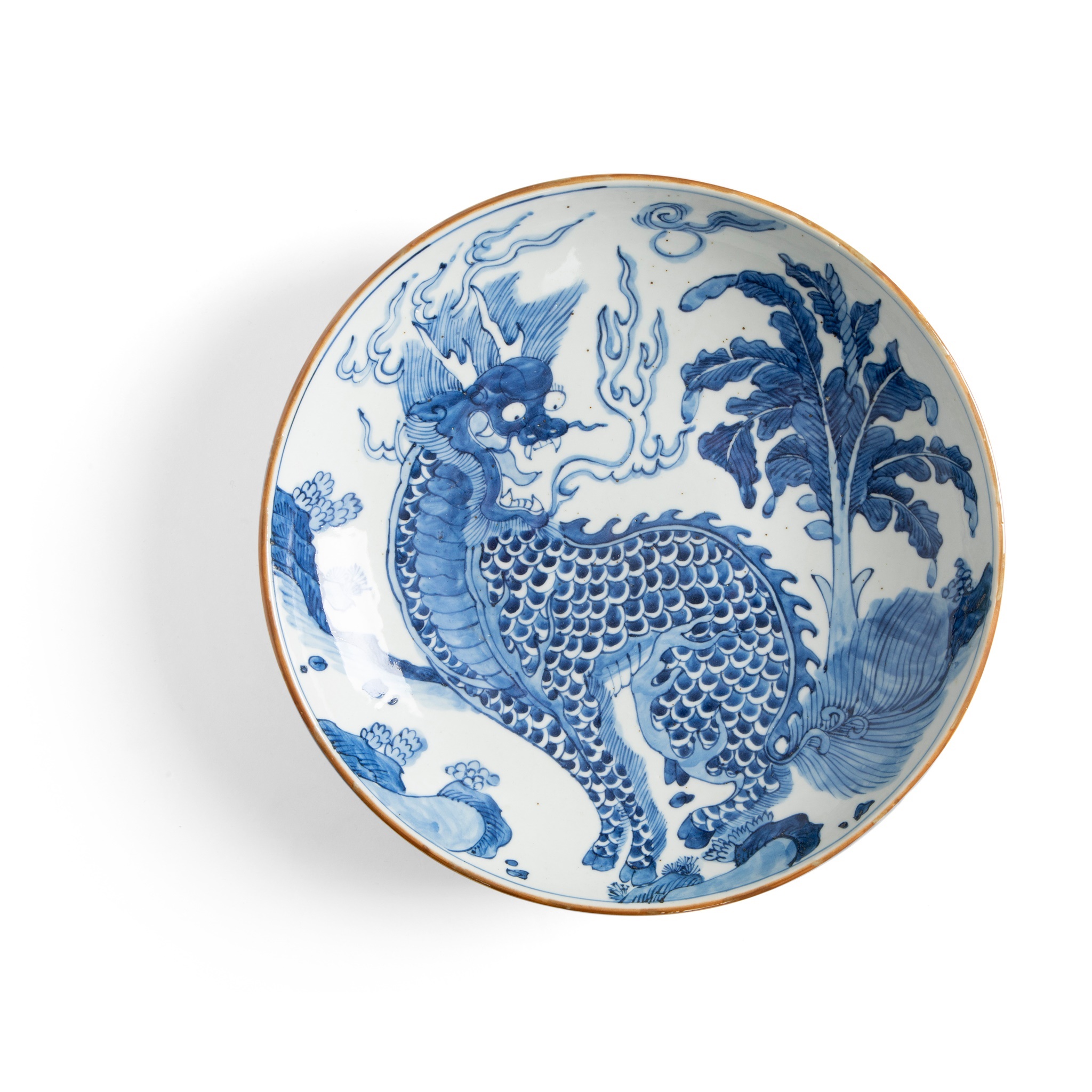 sturdily potted, the interior painted with a snarling seated qilin amongst stylised flames, rocks and plantain beneath the moon, all within a single circle and a brown dressed mouth rim