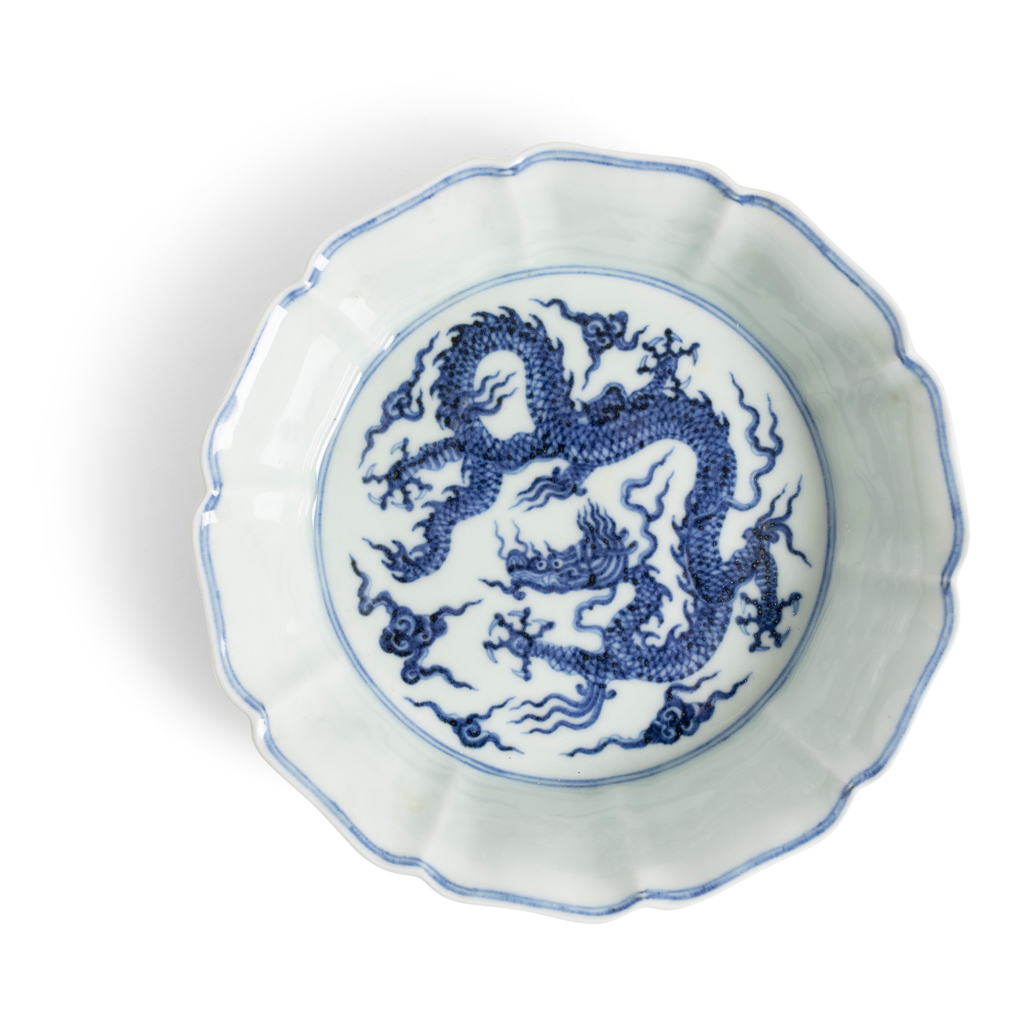 supported on a recessed foot, the foliated sides with canted edge gradually tapering out and terminating to a splayed rim, the interior finely painted with a five-clawed dragon amongst clouds, the exterior painted on each side with a five-clawed dragon interspersed with ascending and descending manner, the base with a double circle mark in underglaze blue with the central mark scrubbed off