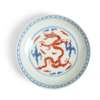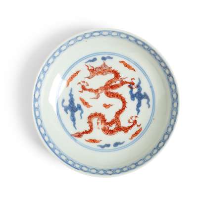 IRON-RED DECORATED BLUE AND WHITE 'DRAGON' DISH