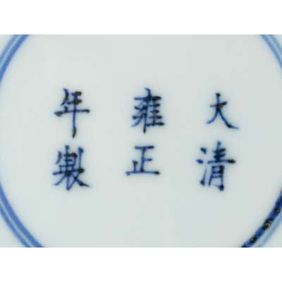 raised on a short straight foot to a rounded shallow body and wide mouth, the exterior painted with a ring of crashing waves near the foot with clouds above, featuring four dragons in iron-red, further with a coiling dragon in the inner central medallion, the base inscribed with a six-character Yongzheng mark in double circles in underglaze blue