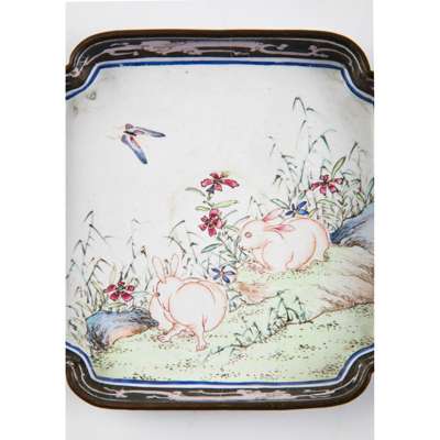 comprising: four square saucers of canted edges, the interior respectively painted with two bulls, two white rabbits with a butterfly, a flying eagle hunting two foxes, and two dogs with their puppy, each scene depicted in a natural landscape setting, enclosed in the meandering chi dragon border on the side against a black ground, the sides on the exterior similarly decorated in blue, each base inscribed with a two-character 'Qi Wan' mark in seal; together with four square cups with canted edge, each supported on a short foot and extending to a splayed rim, each side respectively painted with a grey bull, two cranes under a pine tree, two deer with a bat and two rabbits, the interior decorated with a small blue flower against the white ground, while the base marked with five dots symbolising a flower head