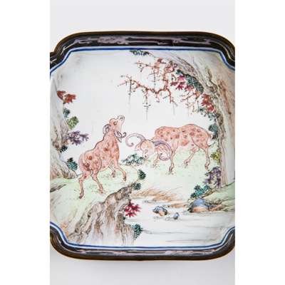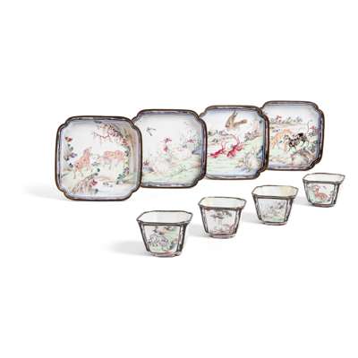 清 廣東銅胎畫琺瑯動物紋方形杯盤(四組八件)