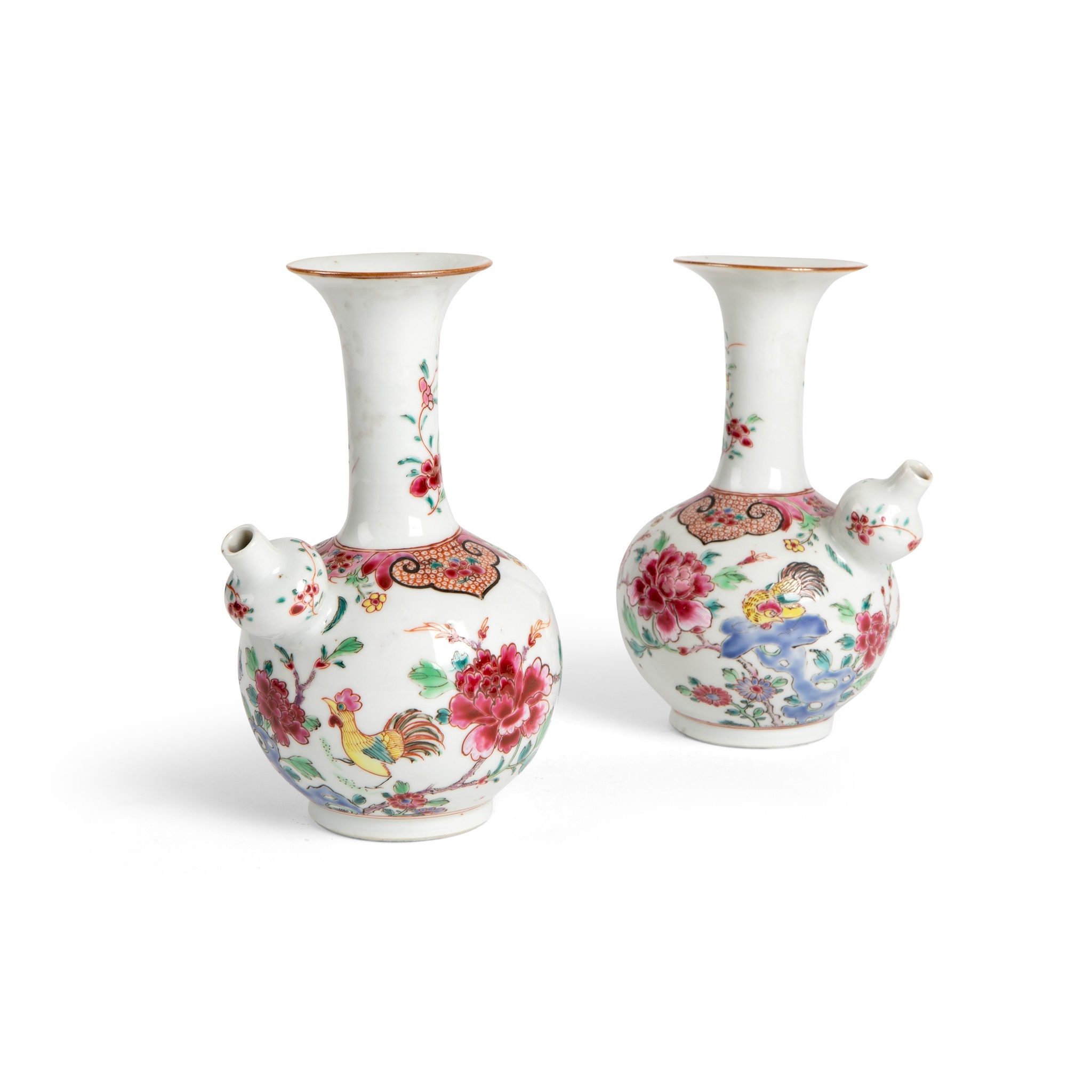 each painted with two roosters, one striding among the blossoming peony flowers, the other standing on a rock, the shoulder delicately painted with flower head in stylised ruyi patterns, the slender neck and the bulbous spout painted with flowers with foliage, the mouth rim painted in brown