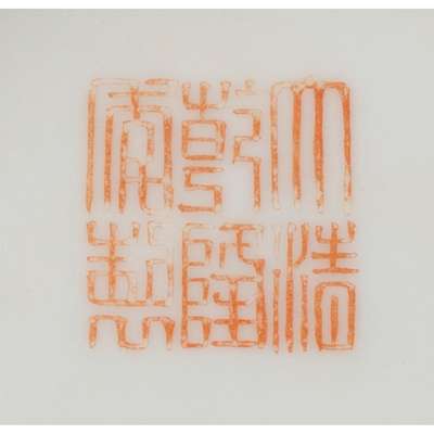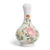 potted with a globular body supported on a flared foot, raised to a long waisted neck and bulb-headed, finely painted with peony blooms and foliated sprigs issuing from the plain foot, the base inscribed with a six-character Qianlong mark in iron-red
