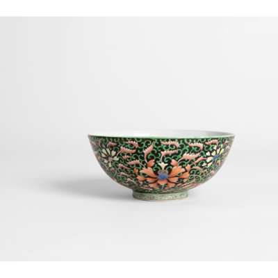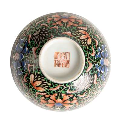 the deep, rounded sides supported on a short straight foot and flaring towards the rim, the exterior decorated with an overall pattern of variously coloured flowers borne on delicate, leafy green meander reserved on a black ground, all between the pale green rim and a narrow band of black classic scroll on a pale green ground encircling the foot, the interior and the base glazed in white, the base inscribed with a six-character Qianlong mark in iron-red