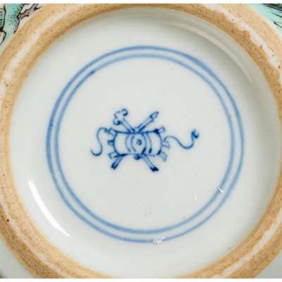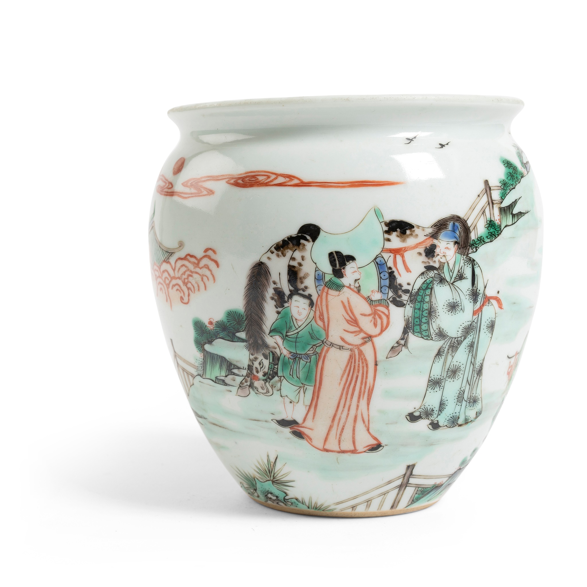 of tapered bulbous body, waisted neck and everted short wide mouth, the exterior finely painted with figures greeting one another before a mottled horse accompanied by an attendant, another attendant leaning against a tree trunk, the base inscribed with a Daoist emblem in underglaze blue