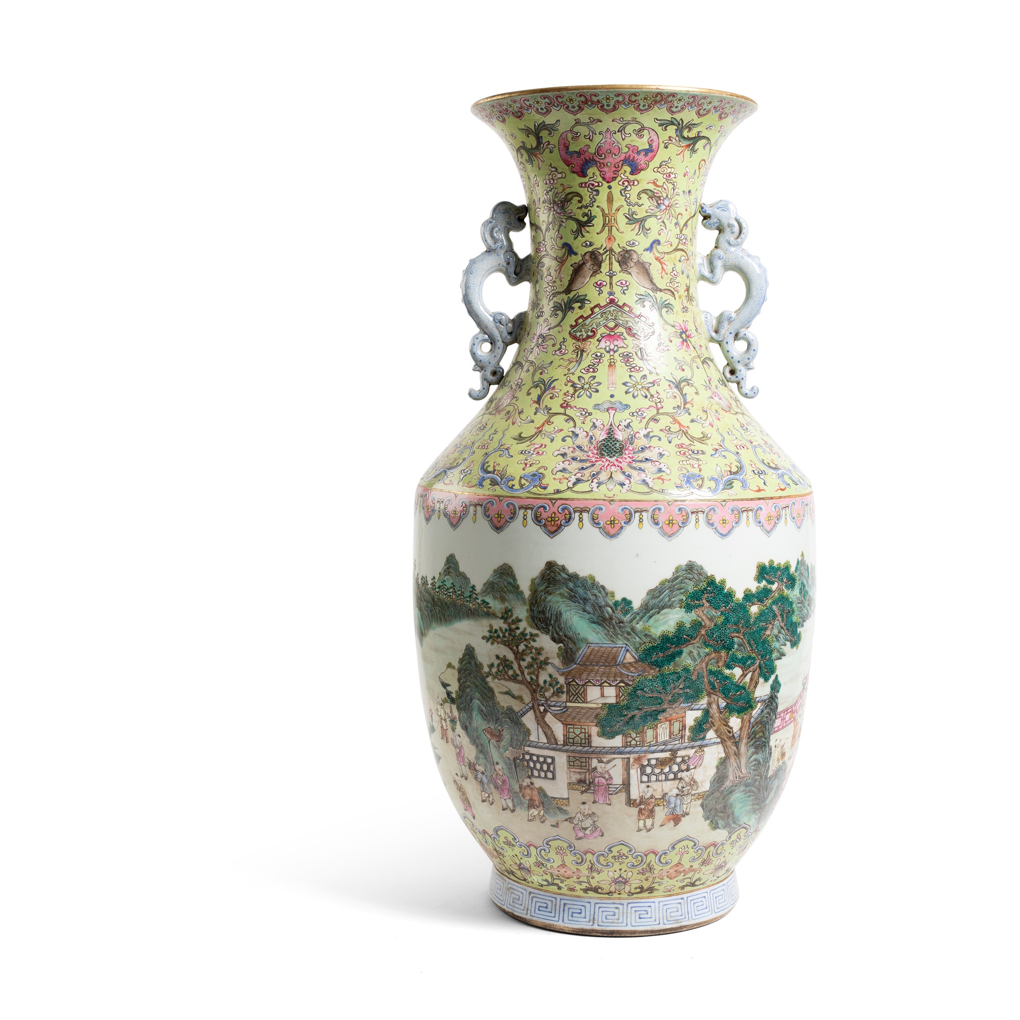 supported on an everted foot, raised to a tapered cylindrical body, the elongated waisted neck terminating at an everted mouth, painted around the body with 'hundred boys' at play celebrating a spring day amidst a dramatic mountainous landscape within two ruyi-bands, enamelled richly on the neck with scrolling lotus and foliated tendrils against an apple-green ground, flanked by a pair of sinuous chi dragons detailed in blue, the base inscribed with a six-character Jiaqing mark in iron-red reserved on a turquoise ground